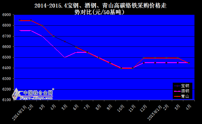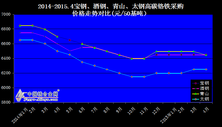 2014-2015.4寶鋼、酒鋼、青山、太鋼高碳鉻鐵采購價格走勢對比(元/50基噸)