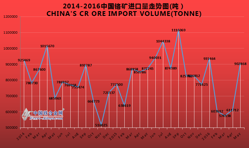 中國(guó)鐵合金網(wǎng)訊:中國(guó)5月份鉻礦進(jìn)口達(dá)902868噸,環(huán)比上漲47.6%,比去年同期下跌3.71%