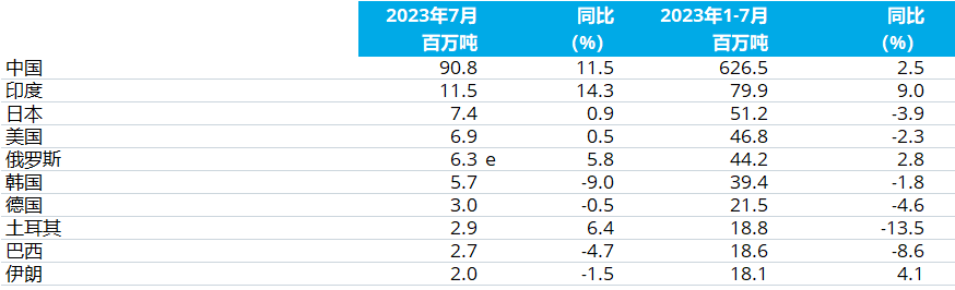 2023年7月全球63個(gè)納入世界鋼鐵協(xié)會(huì)統(tǒng)計(jì)國(guó)家的粗鋼產(chǎn)量為1.585億噸,同比提高6.6%。