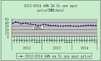 [Ferro-Alloys.com]In the first season of 2012, prices for South Africa chrome ore lumpy 44% remained around ¥40/mtu, to which the prices have never approached in the following three years. It can be seen that the price kept falling since Jun, 2012 until the price reached ¥30/mtu at the end of the year. The price rose to ¥35/mtu in the first season of 2013 but failed to remain at this level, and the price fell and remained at ¥30/mtu for the rest of the year. In the first half of 2014, the price stayed the same as the price of the end of 2013 at ¥30/mtu; the price rallied a little since July. Up to Oct.2014, the price remained at ¥31/mtu.