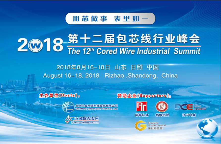 "The 12th Cored Wire Industrial Summit" hosted by Cored Wire Industry Association of China and Ferro-Alloys.com will be held in Rizhao City, Shandong Province from August 16 to 18, 2018.