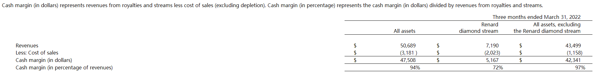 Cash margin (in dollars) represents revenues from royalties and streams less cost of sales (excluding depletion). Cash margin (in percentage) represents the cash margin (in dollars) divided by revenues from royalties and streams.