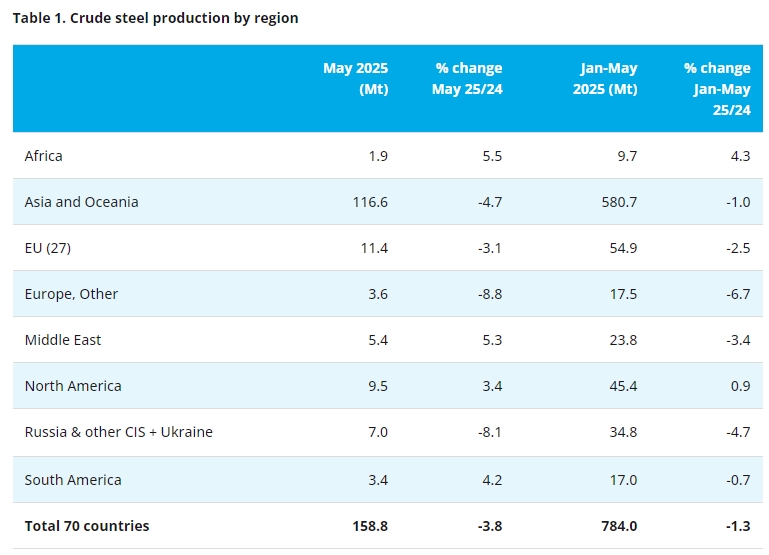 【Ferro-alloys.com】: World crude steel production for the 70 countries reporting to the World Steel Association (worldsteel) was 158.8 million tonnes (Mt) in May 2025, a 3.8% decrease compared to May 2024.