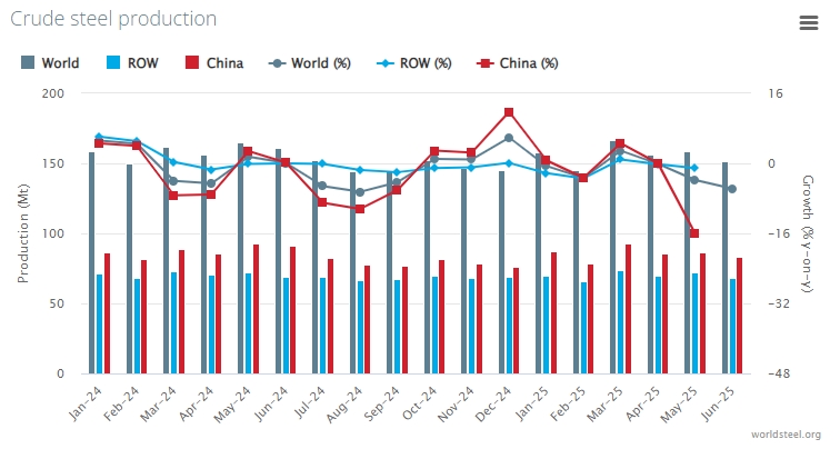 【Ferro-alloys.com】: World crude steel production for the 70 countries reporting to the World Steel Association (worldsteel) was 151.4 million tonnes (Mt) in June 2025, a 5.8% decrease compared to June 2024.