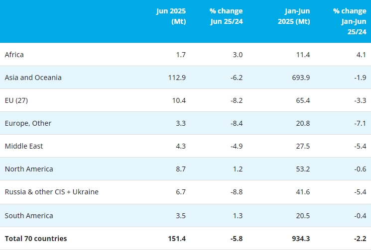 Africa produced 1.7 Mt in June 2025, up 3.0% on June 2024. Asia and Oceania produced 112.9 Mt, down 6.2%. The EU (27) produced 10.4 Mt, down 8.2%. Europe, Other produced 3.3 Mt, down 8.4%. The Middle East produced 4.3 Mt, down 4.9%. North America produced 8.7 Mt, up 1.2%. Russia & other CIS + Ukraine produced 6.7 Mt, down 8.8%. South America produced 3.5 Mt, up 1.3%.