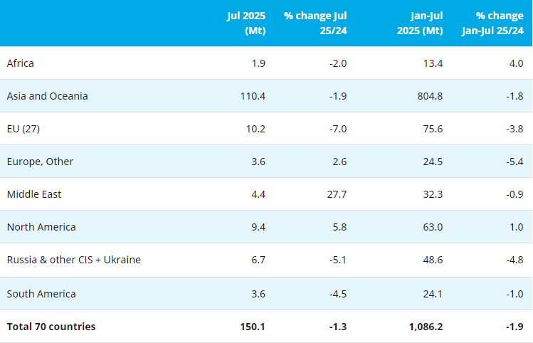 Africa produced 1.9 Mt in July 2025, down 2.0% on July 2024. Asia and Oceania produced 110.4 Mt, down 1.9%. The EU (27) produced 10.2 Mt, down 7.0%. Europe, Other produced 3.6 Mt, up 2.6%. The Middle East produced 4.4 Mt, up 27.7%. North America produced 9.4 Mt, up 5.8%. Russia & other CIS + Ukraine produced 6.7 Mt, down 5.1%. South America produced 3.6 Mt, down 4.5%.